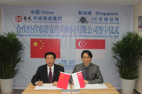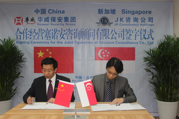 1月26日,經(jīng)山東華威保安集團(tuán)與新加坡JK咨詢控股公司協(xié)商,共同達(dá)成合作經(jīng)營塞諾安公司業(yè)務(wù)。北京塞諾安咨詢顧問公司是華威集團(tuán)全資子公司,主要從事安全風(fēng)險評估、商務(wù)咨詢、高端培訓(xùn)等業(yè)務(wù)。華威集團(tuán)常務(wù)副總裁楊中河、JK咨詢控股集團(tuán)總裁郭志豪出席簽字儀式。